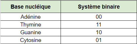 Vous voyez qu’à chaque base d’ADN (à gauche du tableau) correspond une séquence binaire (à droite du tableau).