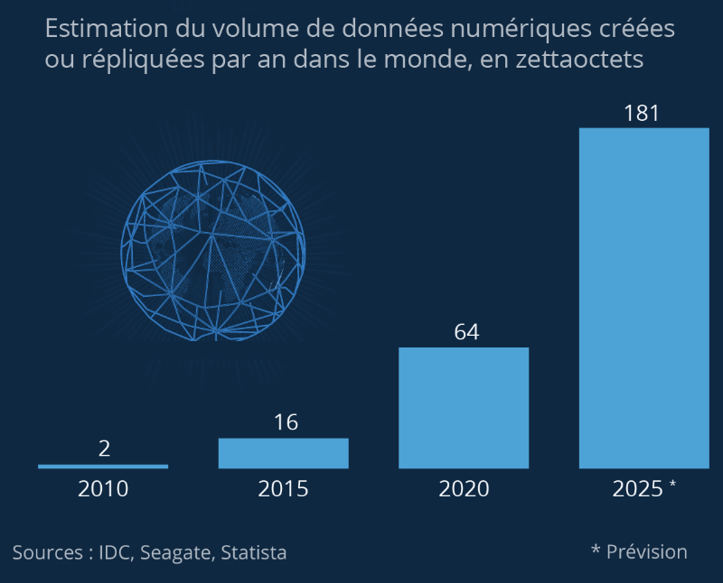 À l’horizon 2025, ce chiffre devrait encore grimper de façon exponentielle pour frôler les 181 zettaoctets de données produites par an :